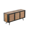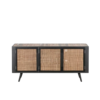 The Itzamna Sideboard is a sophisticated fusion of natural elements and bold modernity. With its black-stained wooden frame and handwoven rattan doors, this piece reflects the balance between strength and delicacy found in ancient Mayan architecture. The reclaimed wood top adds a touch of rustic character, while the tapered legs provide a mid-century modern silhouette. Inside, spacious compartments offer ample storage, making it a stylish and functional addition to any contemporary, bohemian, or industrial-style interior.