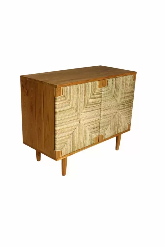 A stunning accent cabinet that blends natural elegance with modern craftsmanship. The Palma Cabinet features a solid wood frame complemented by intricately handwoven rattan panels forming an eye-catching geometric pattern. Elevated on tapered legs for a mid-century flair, this piece provides ample storage while adding texture and warmth to any space. Perfect for living rooms, dining areas, or bedrooms, it is both functional and decorative.